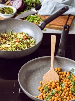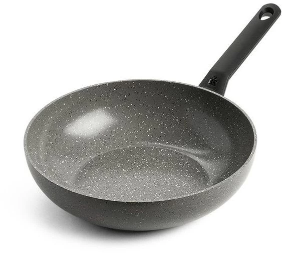 Met de BK Wokpan Granite Aluminium ø 28 cm bak je gezond op alle warmtebronnen. Deze wokpan heeft een moderne stonelook coating en een keramische anti-aanbaklaag. Je hebt daardoor weinig tot geen vetten nodig om te bakken terwijl de pan de hitte wel goed en efficiënt verdeelt. De pan is geschikt voor alle warmtebronnen en na gebruik kan hij gewoon in de vaatwasser.