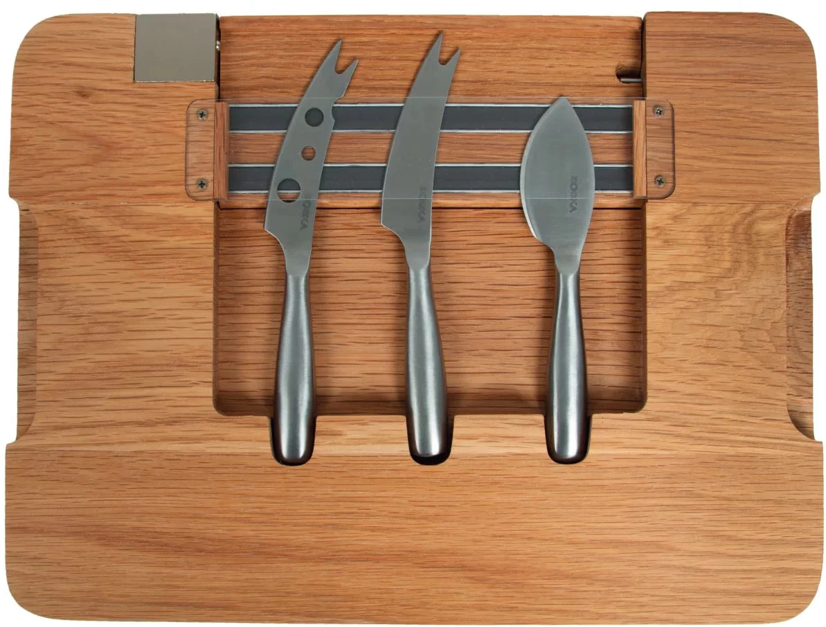 Verras je familie en vrienden met de lekkerste kaas, tapas of andere (borrel)hapjes. Op deze plank van eikenhout ziet het er nog smaakvoller uit. Berg je messen na gebruik op in het handige opbergvak aan de onderkant. Of klik ze vast aan de magneetstrippen. Zo blijven ze mooi op hun plek en kun je er gemakkelijk bij.