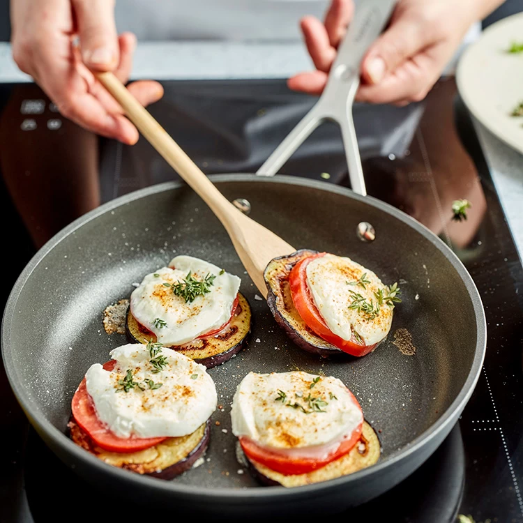 Met deze set koekenpannen (24 en 28 cm doorsnede) gaat bakken als vanzelf. Beter nog: je hebt heel weinig vetstof nodig voor een rijke smaak. Zalmfilet, worstjes, kipsatés, groenten, eieren en tofu … Noem maar op, alles lukt in deze vlot hanteerbare pannen uit de serie.