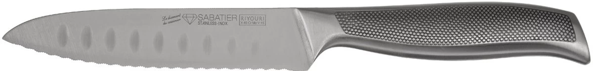 Zoek je een keukenmes voor het snijden van producten als tomaat, worst en kaas? Dan is dit mes van Diamant Sabatier uit de Riyouri collectie de oplossing. Dit tomatenmes beschikt over diverse kuiltjes en een gekarteld lemmet. Een zwarte geschenkdoos zorgt ervoor dat u dit mes voor in de keuken ook cadeau kunt geven. Met dit mes snij je de kleine producten met een hardere rand. Wij raden aan het mes na gebruik met de hand te reinigen.