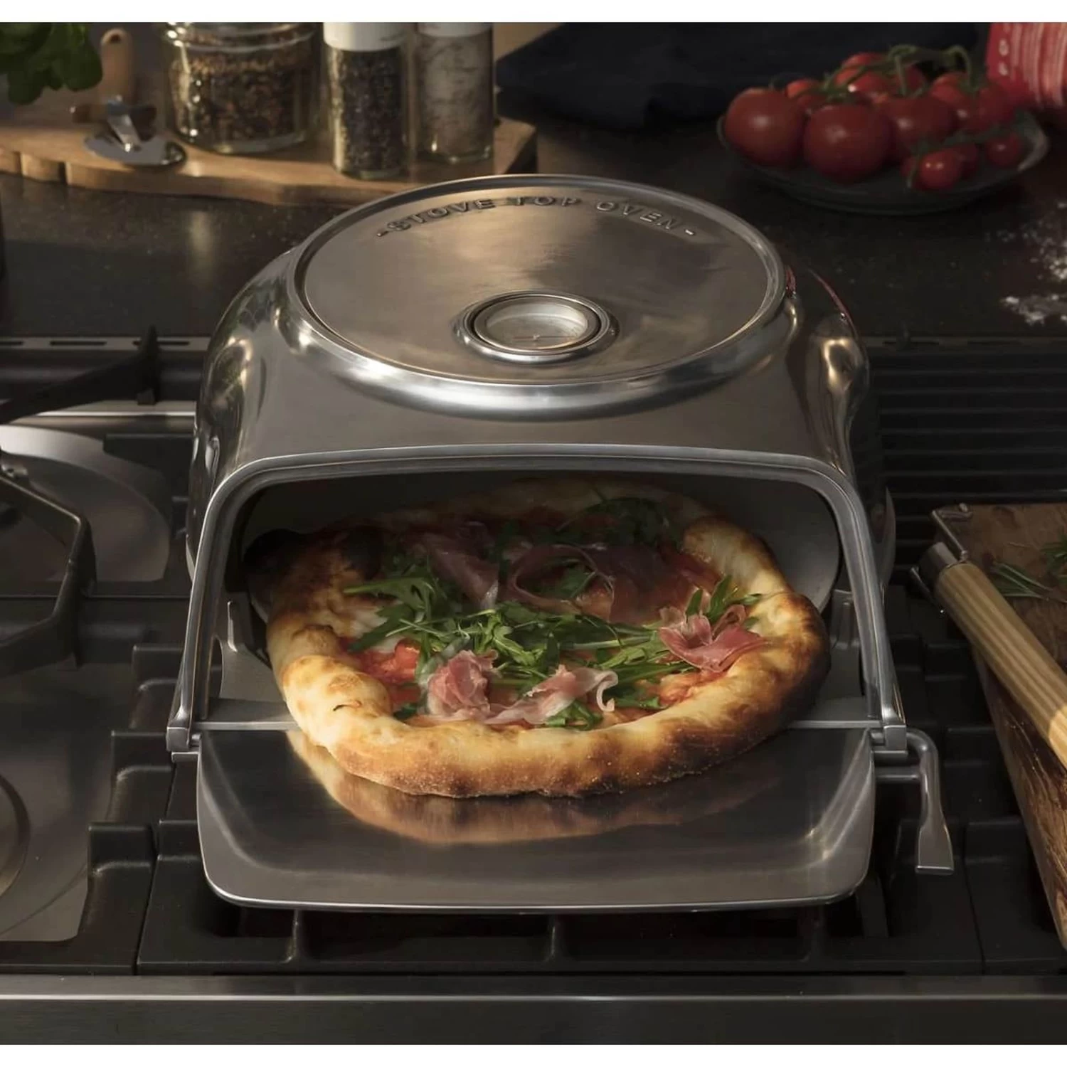 De heerlijkste pizza’s maak je nu thuis met deze Cookinglife Fernus & Friends pizza oven! Het compacte oventje dient geplaatst te worden op je gasfornuis, waarna hij een temperatuur van 350º Celsius bereikt. De perfecte temperatuur voor het bakken van pizza’s en andere deeg gerechten. Binnen 4 minuten heb jij de allerlekkerste pizza in handen, zoals je ze kent uit Italië! Een groot voordeel is dat deze pizza oven geschikt is voor zowel binnen en buiten!
