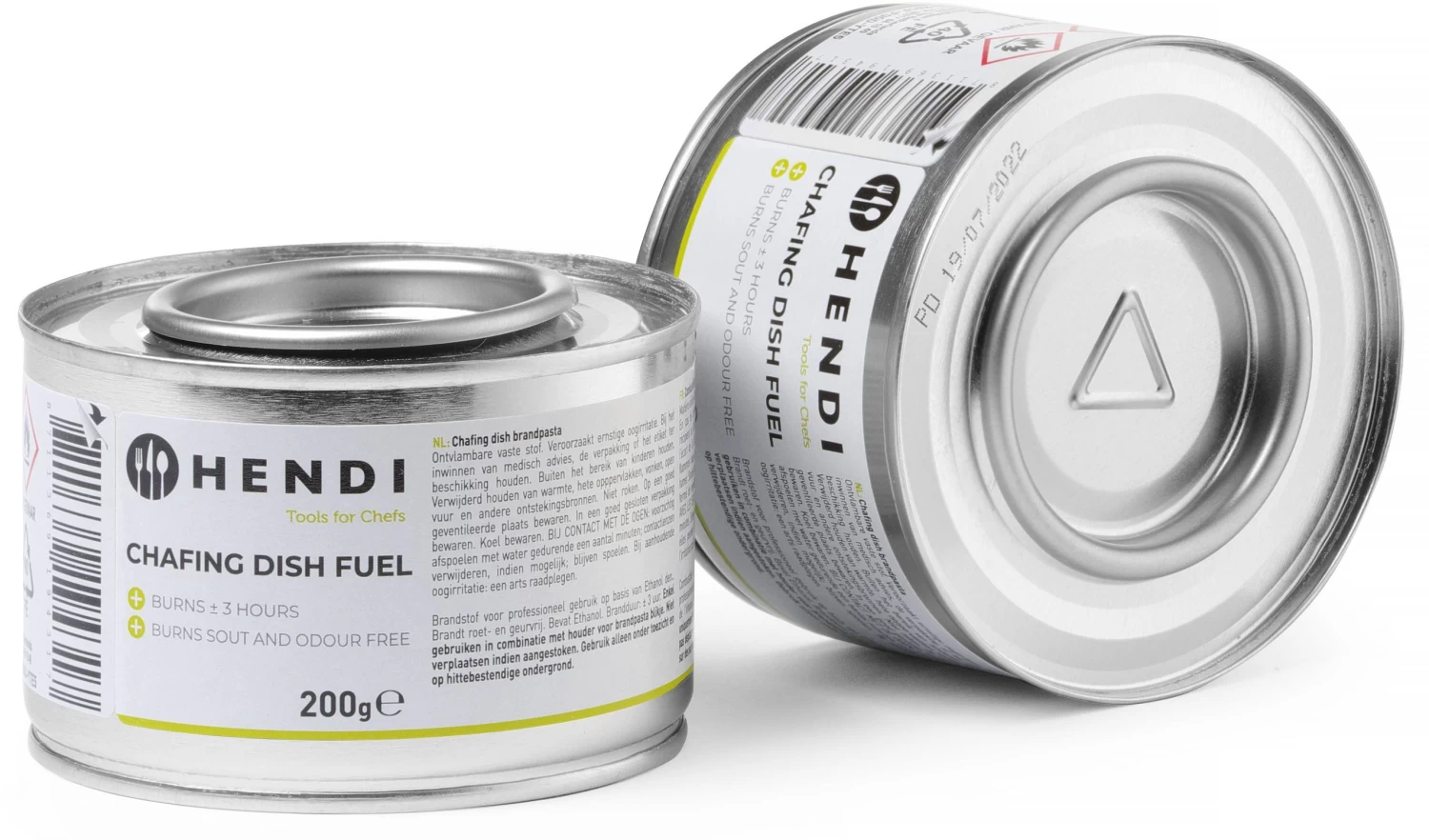 Hendi Brandpasta is gemaakt van natuurlijke (bio) ethanol alcohol, gemengd met water en een verdikkingsmiddel. Brandpasta wordt kunstmatig zo bitter gemaakt dat het niet doorgeslikt kan worden. Om chaving dishes (warmhoud bakken) te verhitten heeft u speciale brandpasta houders nodig. De brandduur is ongeveer 3 uur.