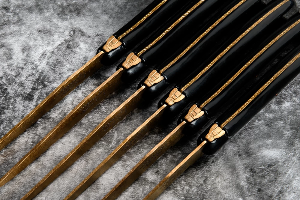Snij jouw steaks vanaf nu in style met deze Laguiole Style de Vie Steakmessen Prestige Line Koper – 6 Stuks! De messen zijn gemaakt van roestvrij staal en worden per 6 verpakt in een houten tray. De steakmessen hebben een koperen kleur met een zwart handvat en een gekartelde lemmet. Na het gebruiken van de Laguiole Style de Vie Steakmessen Prestige Line Koper – 6 Stuks kunnen deze eenvoudig worden gereinigd in de vaatwasser. maar let op! Ze zijn vaatwasserbestendig tot 55 graden, handwas wordt aangeraden.