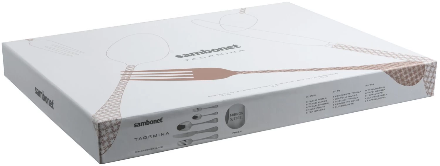 Klassiek, rustig en geïnspireerd door modetrends, dat is wat de Sambonet Taormina collectie is. Het bestek uit deze collectie wordt gekenmerkt door de print op de handvaten. Taormina is een verfijnd, modieus en tijdloos bestek wat prachtig staat op elke tafel. Verkrijgbaar in de bekende Sambonet kleuren en dankzij de PVD Coating is dit bestek extra stevig, kleurvast en 100% vaatwasserbestendig.