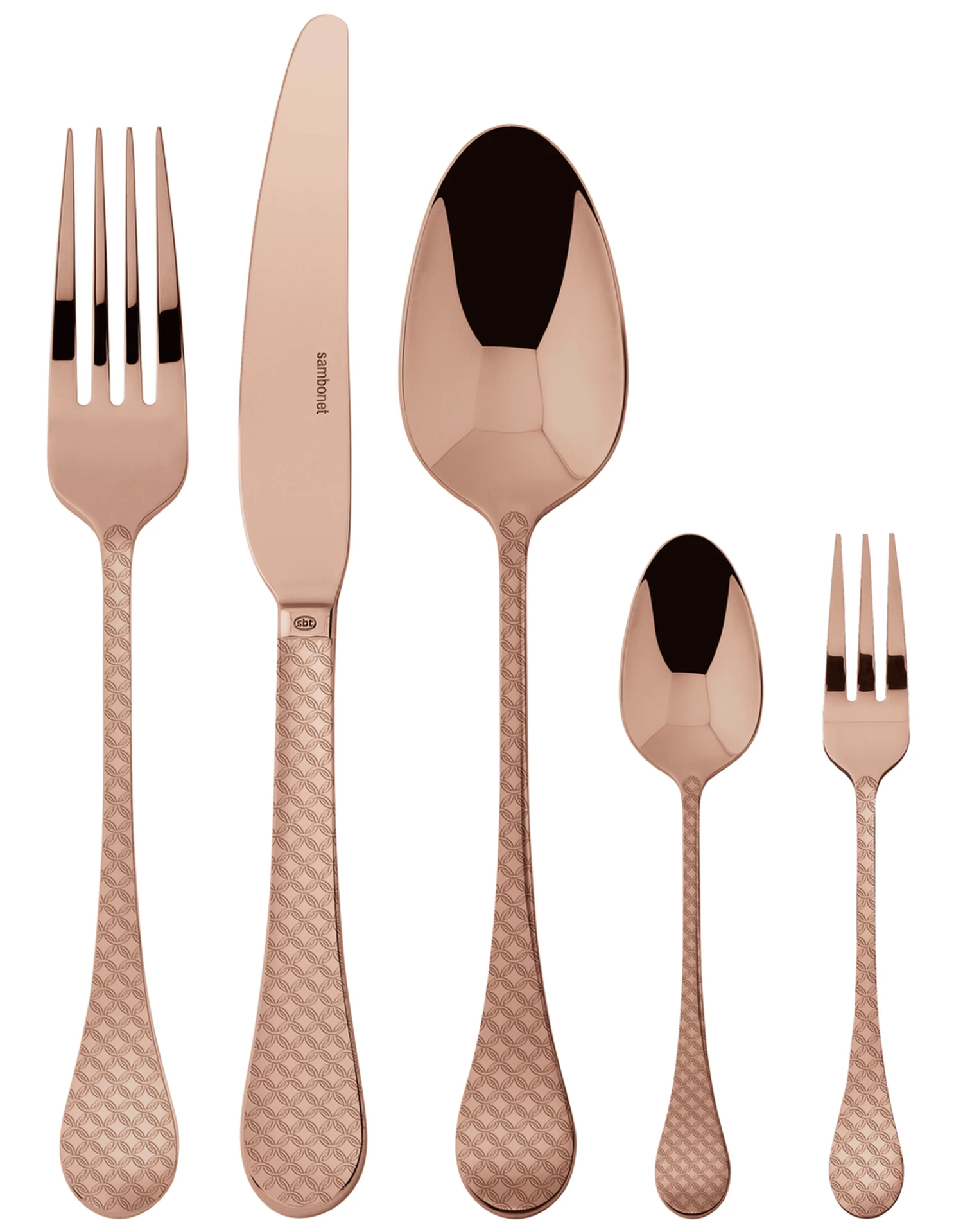 Sambonet heeft een eigen technologie ontwikkeld om hun bestek kleurvast en extra stevig te maken. Het zogenaamde PVD – Physical Vapour Deposition – proces. Deze speciale behandeling zorgt ervoor dat er op moleculair niveau het metaal wordt behandeld. Hierdoor ontstaat een extra hard metaal dat veel weerstand krijgt en ontstaan de welbekende kleuren van sambonet. Dankzij de PVD kan al het bestek in de vaatwasser, is het krasvrij en blijft de kleur extra lang mooi.