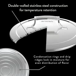 De geëmailleerde gietijzeren Hapjespan behoudt en verdeelt warmte gelijkmatig. Het lichtgewicht, roestvrijstalen deksel van deze Hapjespan presteert beter dan andere zware gietijzeren deksels, met verbeterde temperatuurbehoud en minder verdamping.