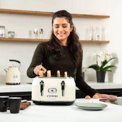 De Westinghouse Retro Broodrooster heeft een automatisch centreersysteem waardoor het brood wordt bewaard in het midden voor gelijkmatige bruiningsresultaten aan beide zijden.